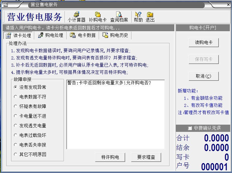 2、我們出廠之前,電表里有20度預(yù)置電量,是給客戶安裝電表用的,電表通電后,要馬上給用戶開(kāi)戶,插IC卡使用,等20度預(yù)置電量用完了,再給用戶開(kāi)戶,插IC卡,電表就不識(shí)別了。