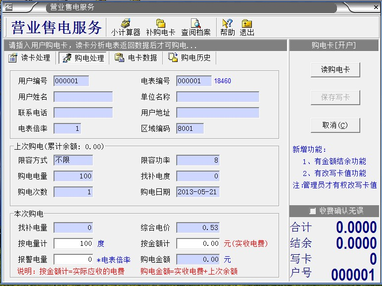 3、電表第一次使用,電表里有20度預(yù)置電量,是不能用完,要馬上給用戶開(kāi)戶,插IC卡使用,第二次是沒(méi)關(guān)系的,用完了再?zèng)_也是可以的。